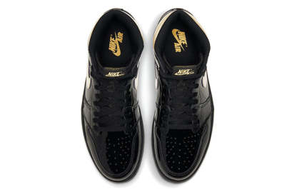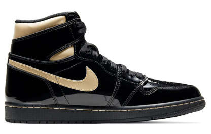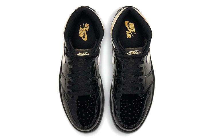 Nike Air Jordan 1 Retro High OG “Black Metallic Gold” featured black and metallic gold color scheme. made of black patent leather with golden lacquer Swooshes and ankle collar. Other details include a nylon tongue with the "Nike Air" trademark affixed to the black rubber sole.